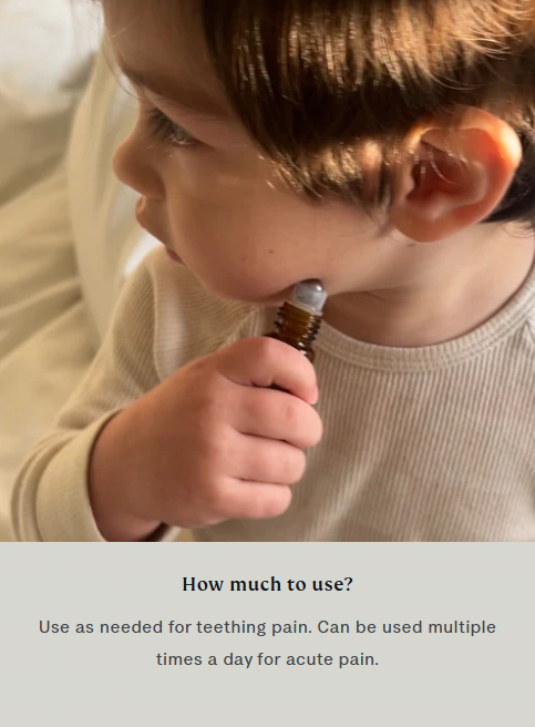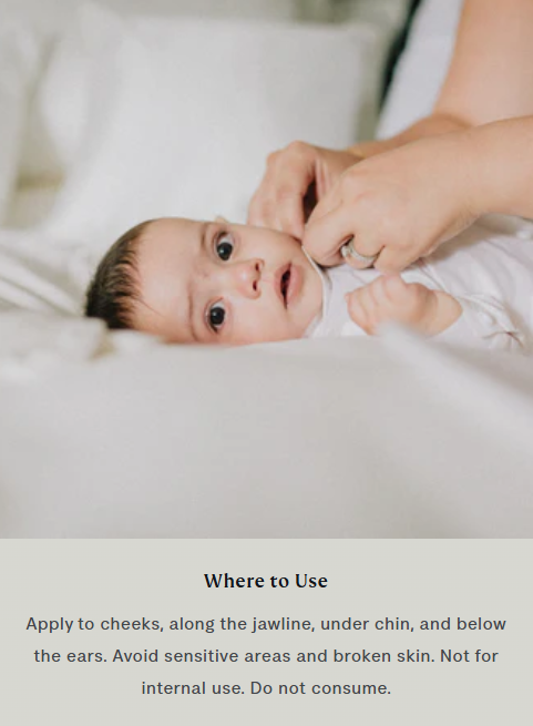 Answer 3: Simply roll the applicator along your baby's cheeks and jawline to apply the soothing blend. It's easy to use, making it perfect for quick relief at home or on-the-go whenever your baby needs comfort.